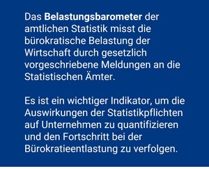 Der Eindruck ist nachvollziehbar, aber wenn man es genauer betrachtet, ist die Belastung durch amtliche Statistikpflichten im Vergleich gering. Laut dem Belastungsbarometer des Statistischen Bundesamts liegt dieser Anteil an den gesamten Bürokratiekosten aus Bundesrecht bei unter einem Prozent. Das Belastungsbarometer wurde erstmals für das Jahr 2006 ermittelt. Es stellt einen Subindex zum Bürokratiekostenindex (BKI) der Bundesregierung dar.